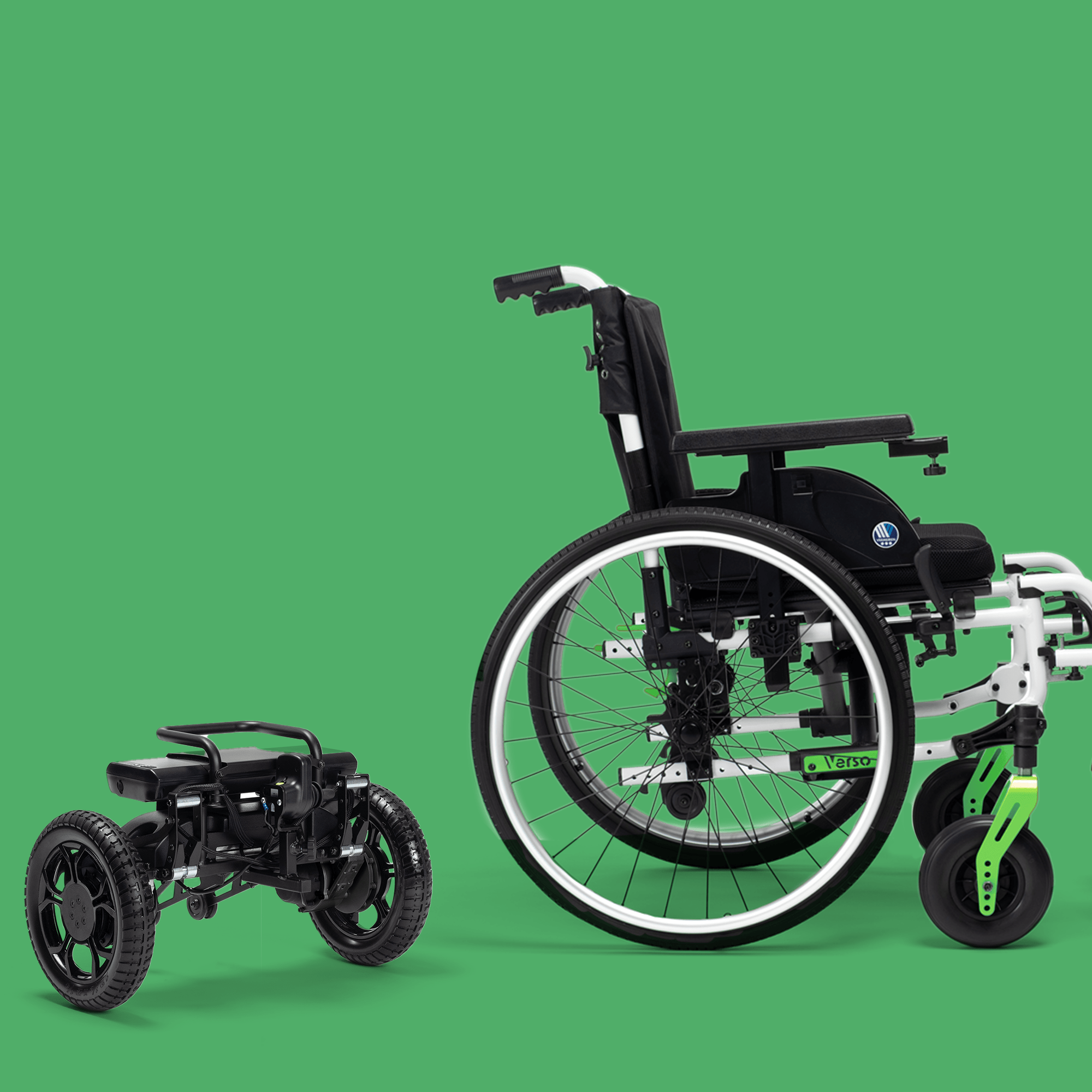 Verso offers a quite unique option for people who are in need of both a manual and powered wheelchair. With our 24” wheel kit you can easily change between manual or powered driving. Plug and drive!